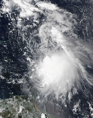The image above shows Jerry just east of the Leeward Islands on October 9. The center of circulation ultimately missed the islands, but Jerry's passage dragged an area of heavy rain, displaced south and east of the center, across those areas over the following day.
